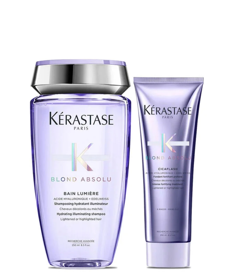 O Kit Shampoo e Condicionador para cabelos loiros da coleção Blond Absolu é um tratamento para cabelos loiros danificados que hidrata e fortalece profundamente a fibra capilar, neutralizando os tons amarelados para alcançar o loiro ideal.
