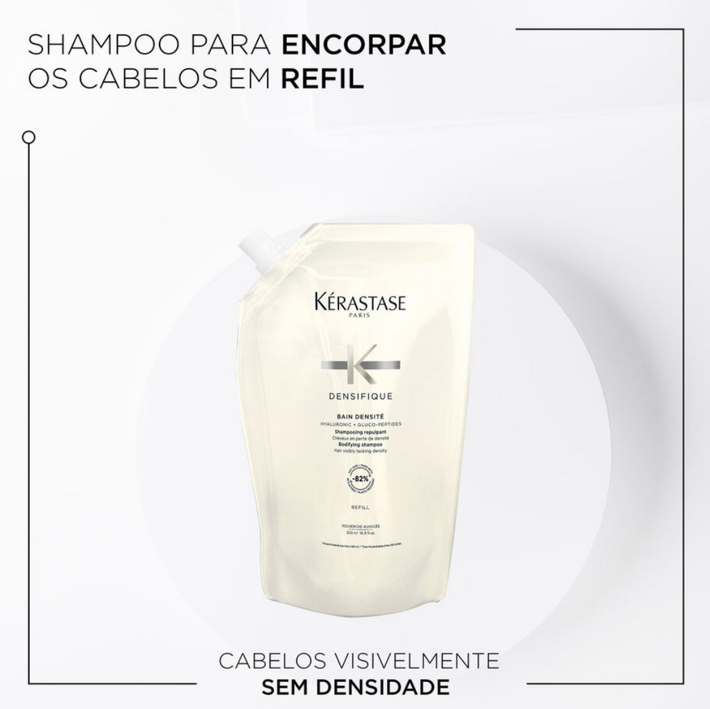 Para prolongar sua experiência com o Bain Densité e promover um consumo consciente, agora você pode adquirir o refil de 500ml . Sua fórmula desenvolvida para fibras capilares com perda de densidade. O Shampoo Kérastase Bain Densité fortalece o cabelo na fibra e desperta os folículos adormecidos para dar mais textura, substância e resistência ao cabelo. O corpo e a elasticidade são restaurados para que o cabelo pareça visivelmente mais encorpado e com aparência mais espessa.