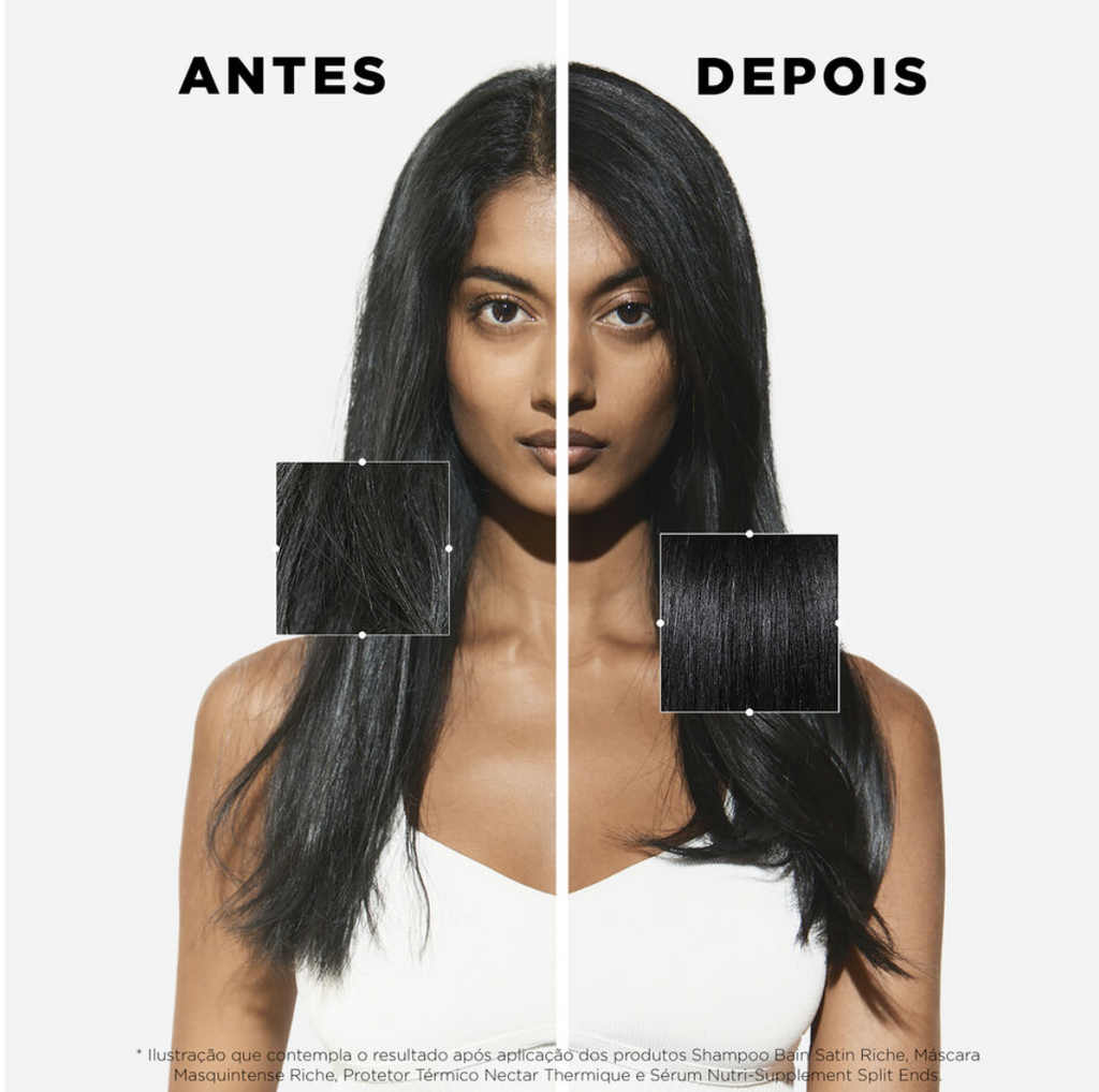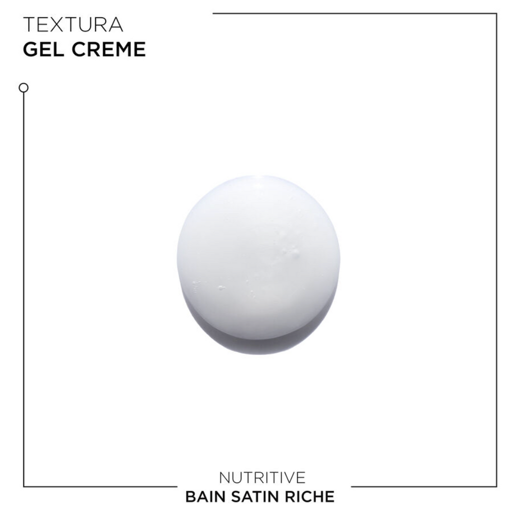 O Shampoo Bain Satin Riche tem uma textura de gel branco e cremoso, com formação de espuma e sem atrito, o que o torna um dos melhores shampoos para couro cabeludo com coceira e para cabelos muito secos.